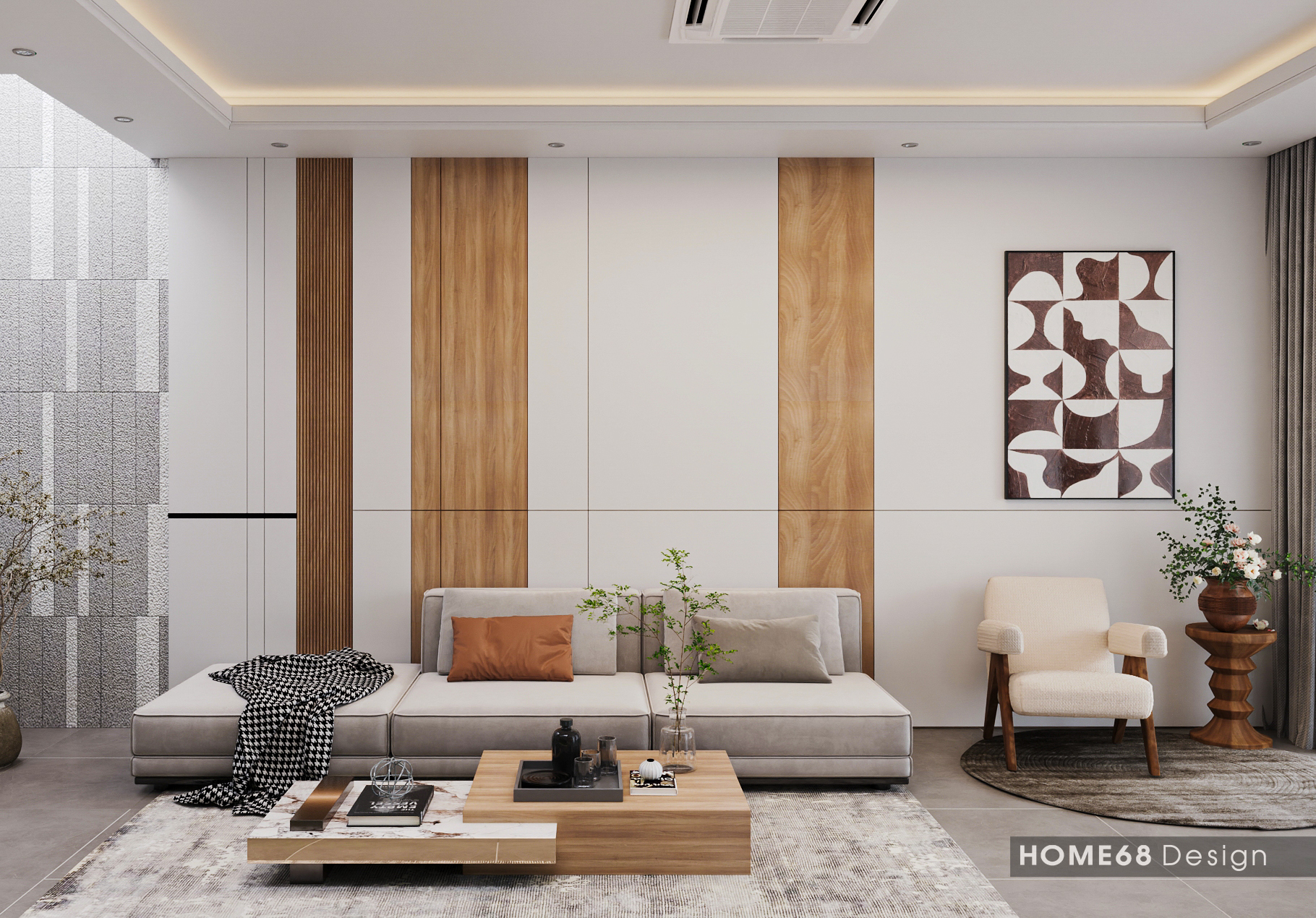 Phòng khách được thiết kế theo phong cách tối giản hiện đại, sử dụng gam màu trung tính làm chủ đạo, điểm nhấn là các mảng ốp gỗ tự nhiên mang lại cảm giác ấm áp và sang trọng. Bộ sofa bọc nỉ cao cấp kết hợp bàn trà gỗ – đá tạo nên sự cân bằng hoàn hảo giữa thẩm mỹ và tiện nghi. Ánh sáng tự nhiên được tận dụng tối đa, giúp không gian luôn thông thoáng và tràn đầy sức sống
