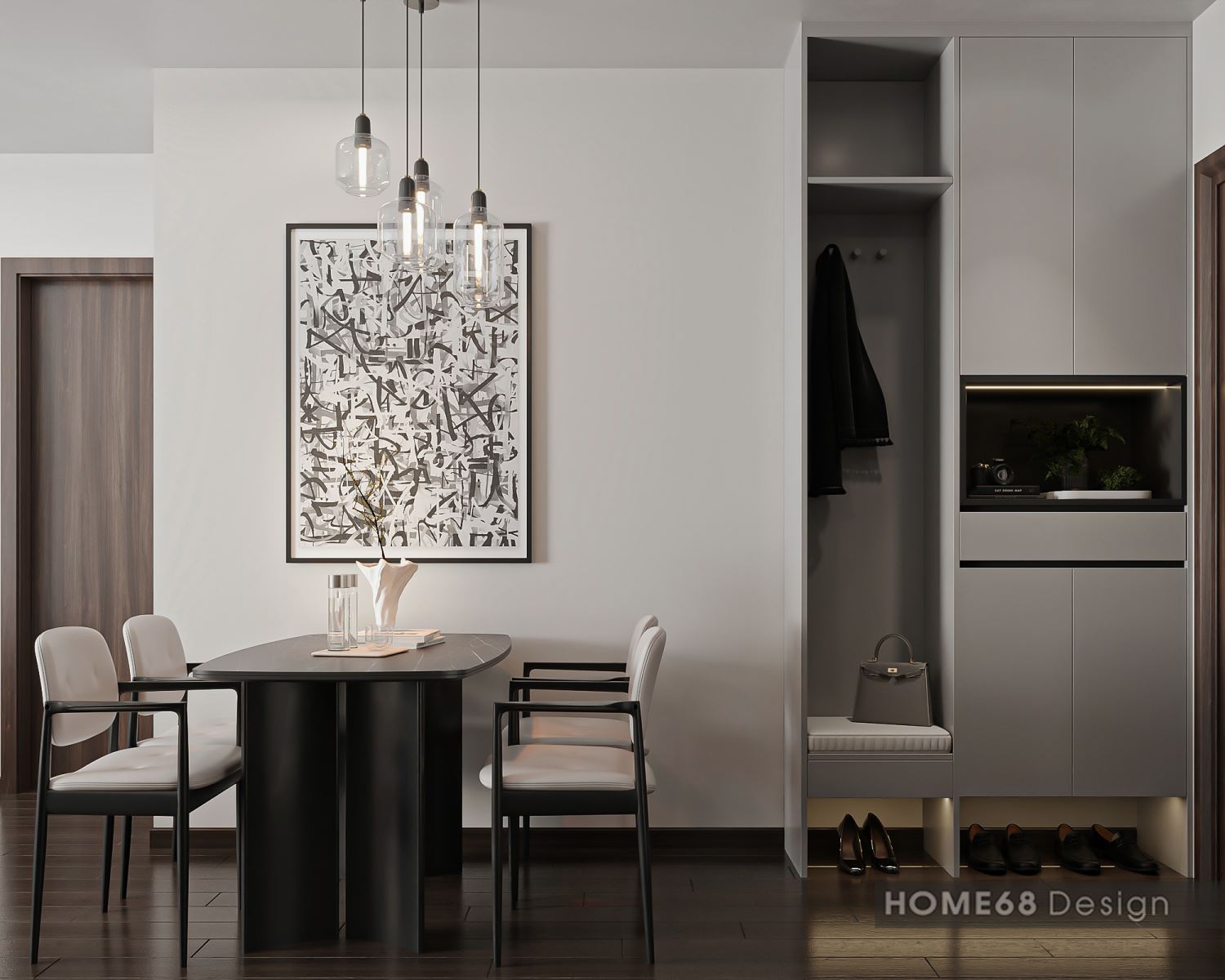 Khu vực bàn ăn được thiết kế tinh giản nhưng vẫn là điểm nhấn nhẹ nhàng trong không gian chung. Bộ bàn ăn có kiểu dáng hiện đại, đường nét thanh thoát, lựa chọn vật liệu và màu sắc hài hòa với tổng thể monochrome, vừa đảm bảo tính thẩm mỹ vừa tạo cảm giác ấm cúng cho các bữa ăn gia đình.