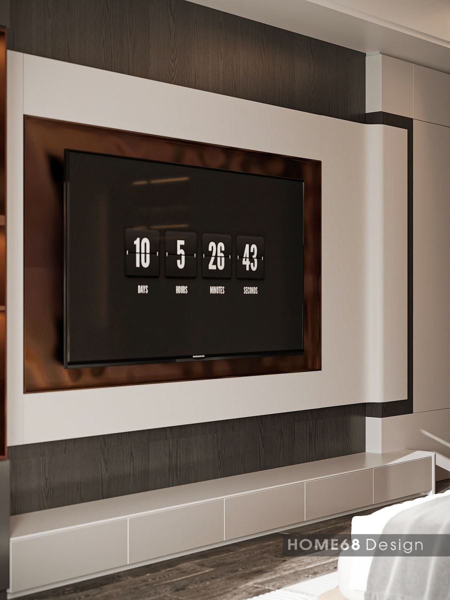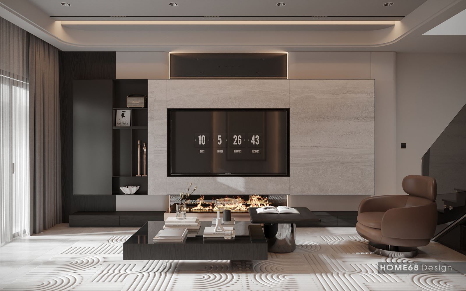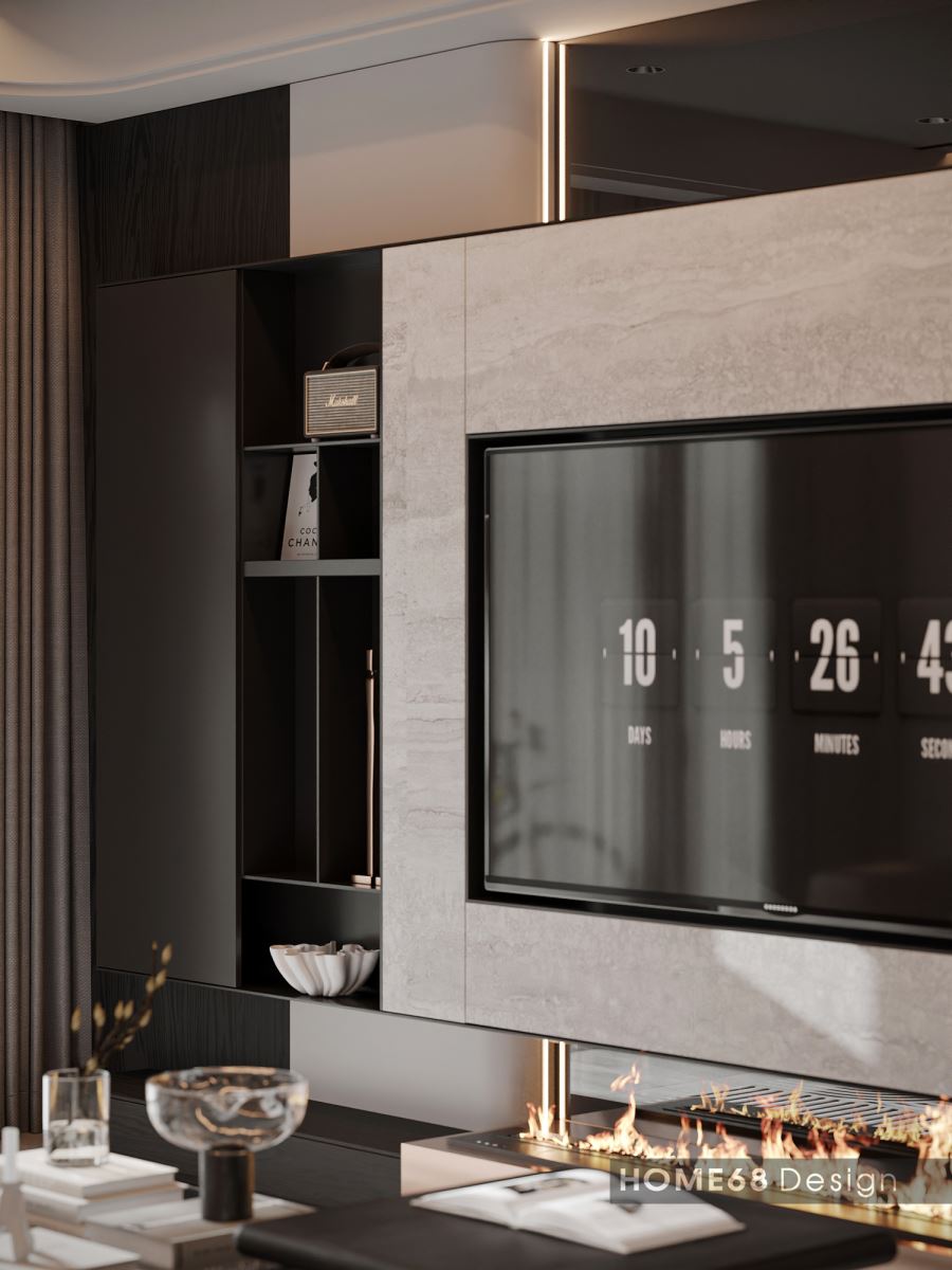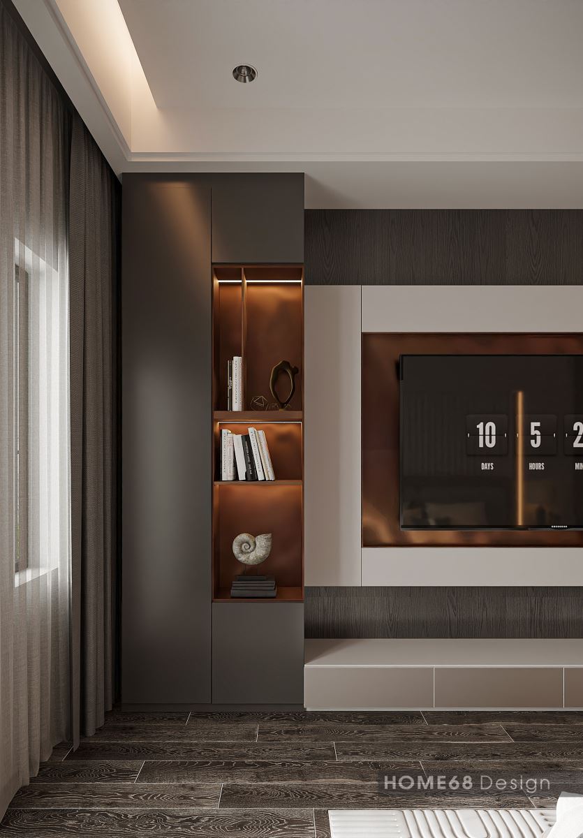 Hệ thống dây điện và thiết bị kết nối được xử lý âm trong vách, đảm bảo tính thẩm mỹ và an toàn khi sử dụng. Bên cạnh đó, HOME68 bố trí thêm ánh sáng hắt nhẹ phía sau hoặc dưới kệ TV, tạo hiệu ứng ánh sáng gián tiếp dịu mắt khi xem vào buổi tối, đồng thời tăng chiều sâu không gian.