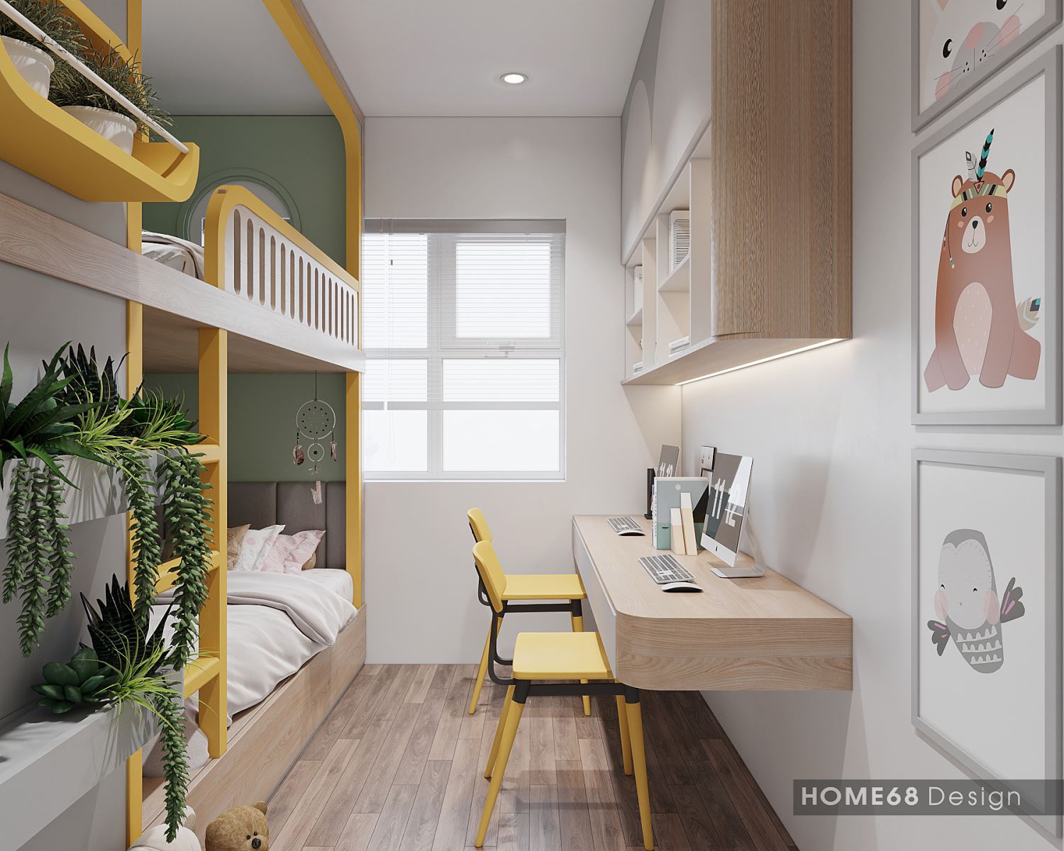 Mẫu thiết kế phòng ngủ dành cho 2 bé con trong căn hộ chung cư hiện lên vẻ đẹp sinh dộng, hiện đại với tone màu vàng nâu hiện đại. Căn phòng có gam màu vàng làm chủ đạo nổi bật trên nền sơn trắng. Căn phòng sử dụng chất liệu gỗ mdf xanh chống ẩm TL phủ melamine vân gỗ kết hợp sơn men cao cấp. Đối diện giường là khu vực bố trí bàn học kết hợp tủ kệ, giá sách tối giản, tiện nghi.