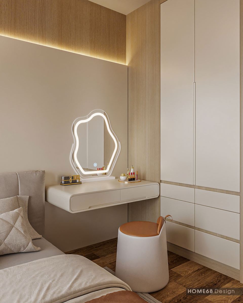 Bàn trang điểm được đặt gần giường, đi kèm với gương hình dạng độc đáo, tạo điểm nhấn thú vị cho không gian. Ghế ngồi đơn giản, nhẹ nhàng, giúp tiết kiệm diện tích mà vẫn đảm bảo tính tiện dụng.