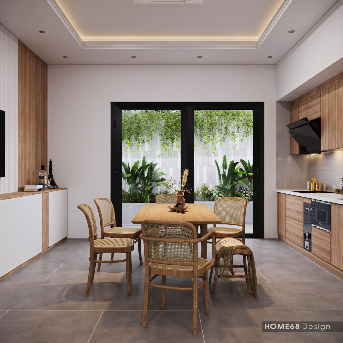 Phòng bếp được thiết kế với cửa kính lớn, mở ra khoảng không gian xanh bên ngoài. Ánh sáng tự nhiên từ bên ngoài làm cho không gian trở nên thoáng đãng và tràn đầy sức sống. Đặc biệt, hệ thống đèn LED âm trần cung cấp ánh sáng dịu nhẹ, tạo ra một bầu không khí ấm cúng, lý tưởng cho những bữa tối gia đình.