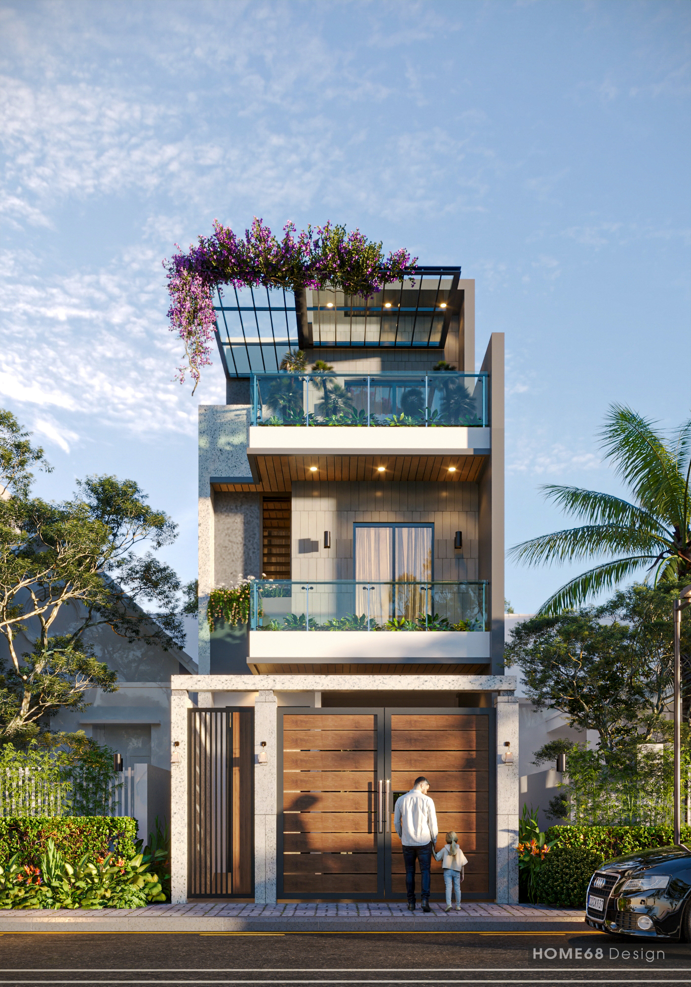 Mặt tiền ngôi nhà gây ấn tượng với hệ ban công kính trong suốt, tông màu trung tính kết hợp gỗ ấm áp, cùng mảng xanh tự nhiên điểm xuyết ở mỗi tầng, mang đến vẻ đẹp vừa hiện đại vừa gần gũi. Tầng thượng được thiết kế với giàn lam kính kết hợp cây leo, vừa tạo điểm nhấn thẩm mỹ vừa giúp điều hòa ánh sáng, mang lại cảm giác thoáng đãng và kết nối với thiên nhiên.