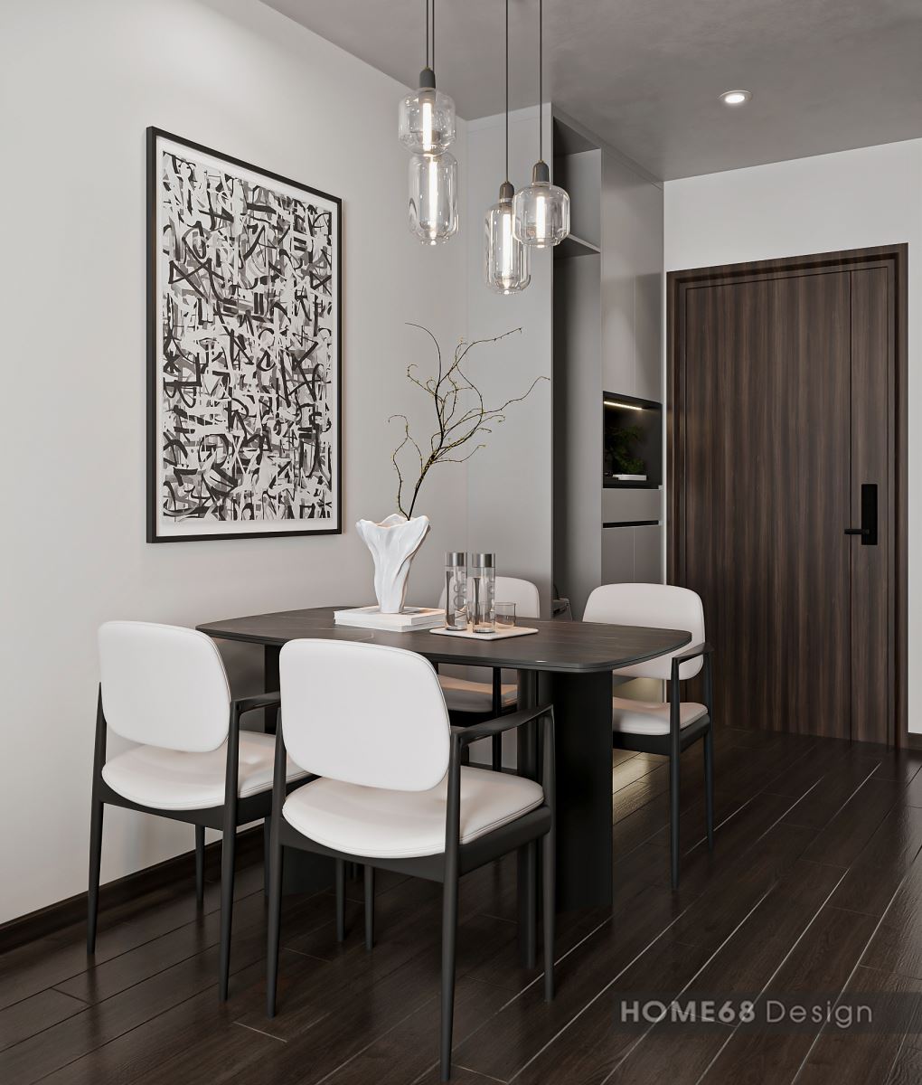 Khu vực bàn ăn được thiết kế tinh giản nhưng vẫn là điểm nhấn nhẹ nhàng trong không gian chung. Bộ bàn ăn có kiểu dáng hiện đại, đường nét thanh thoát, lựa chọn vật liệu và màu sắc hài hòa với tổng thể monochrome, vừa đảm bảo tính thẩm mỹ vừa tạo cảm giác ấm cúng cho các bữa ăn gia đình.