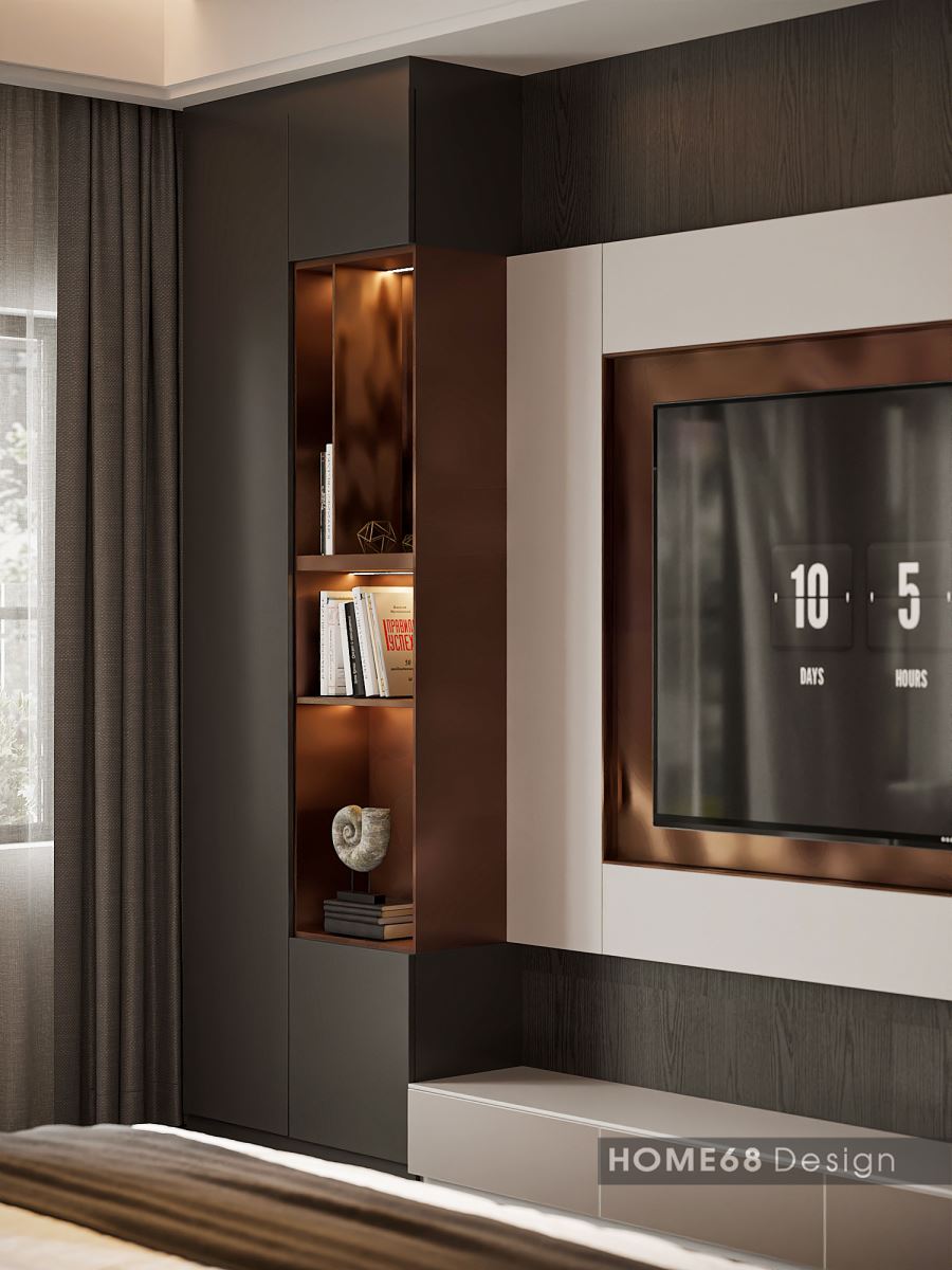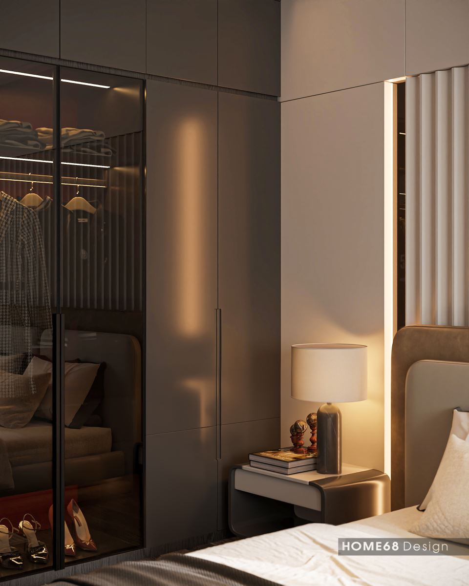 Bố cục công năng được HOME68 nghiên cứu kỹ lưỡng nhằm tối ưu trải nghiệm sử dụng. Khu vực giường ngủ được bố trí thoáng gọn, đảm bảo lối di chuyển thuận tiện hai bên. Hệ tủ quần áo thiết kế liền mạch theo mảng tường, giảm thiểu chi tiết rời rạc và tăng diện tích lưu trữ. Các ngăn tủ được phân chia khoa học, phù hợp với nhu cầu sử dụng thực tế, giúp không gian luôn gọn gàng và ngăn nắp.
