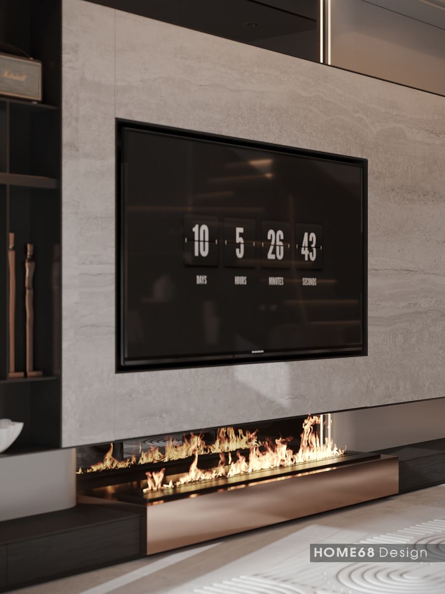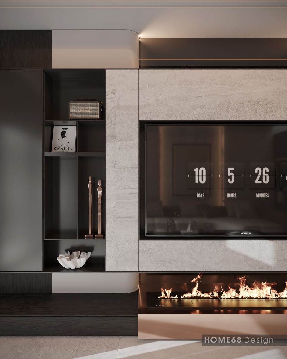 Hệ thống dây điện và thiết bị kết nối được xử lý âm trong vách, đảm bảo tính thẩm mỹ và an toàn khi sử dụng. Bên cạnh đó, HOME68 bố trí thêm ánh sáng hắt nhẹ phía sau hoặc dưới kệ TV, tạo hiệu ứng ánh sáng gián tiếp dịu mắt khi xem vào buổi tối, đồng thời tăng chiều sâu không gian.