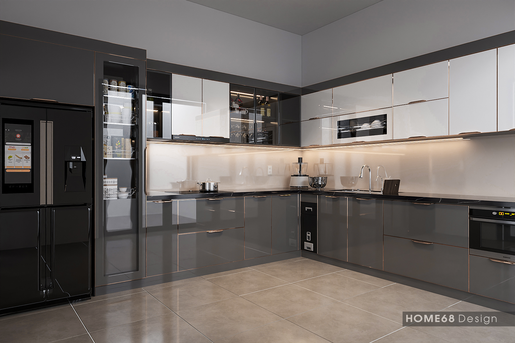 Hệ tủ bếp gồm tủ bếp trên và dưới được cấu tạo từ thùng nhựa picomat. Cánh kính cường lực 5mm tràn viền màu xám lông chuột, viền bo nhôm nhập khẩu mạ Anobe màu vàng hồng. Mặt kính cường lực 10mm ốp tường màu đen, chạy led hắt âm tủ.